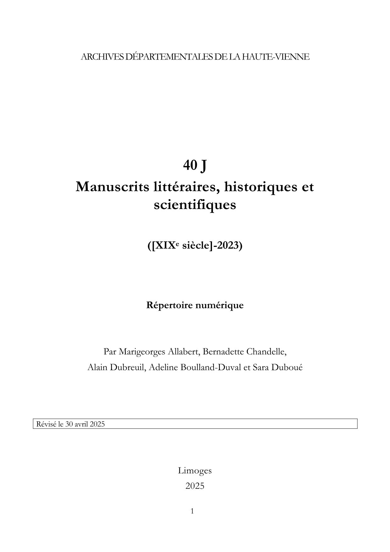 40 J. Répertoire numérique, par Sara Duboué et al., tenu à jour depuis 1994, 101 p. dact.