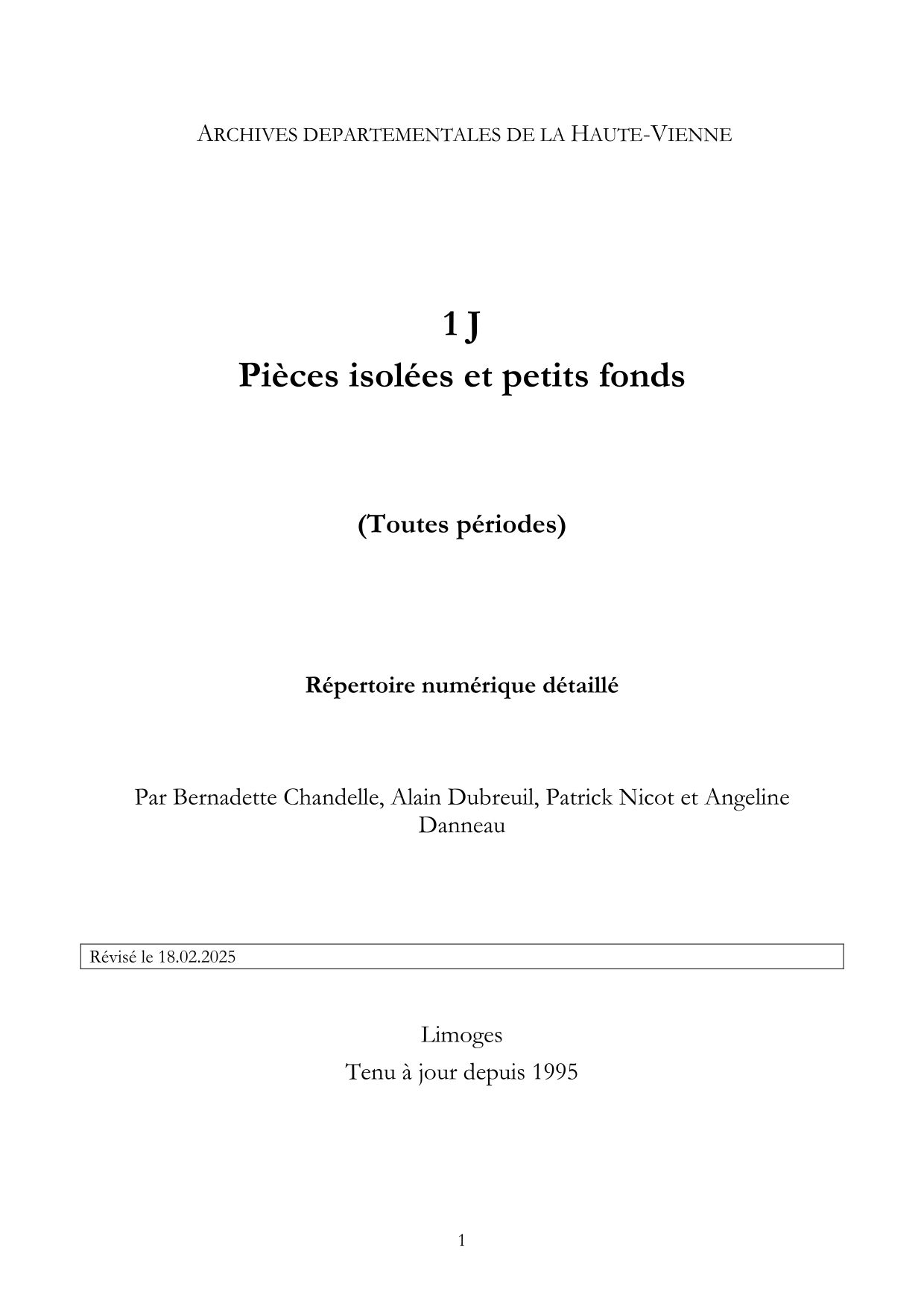 1 J 1 à 1075. Répertoire numérique détaillé, par M. Allabert, B. Chandelle, A. Dubreuil, A. Boulland, L.-M. Malinvaud, P. Nicot et Angeline Danneau, tenu à jour depuis 1995, 249 p. dact., index (classement en cours)