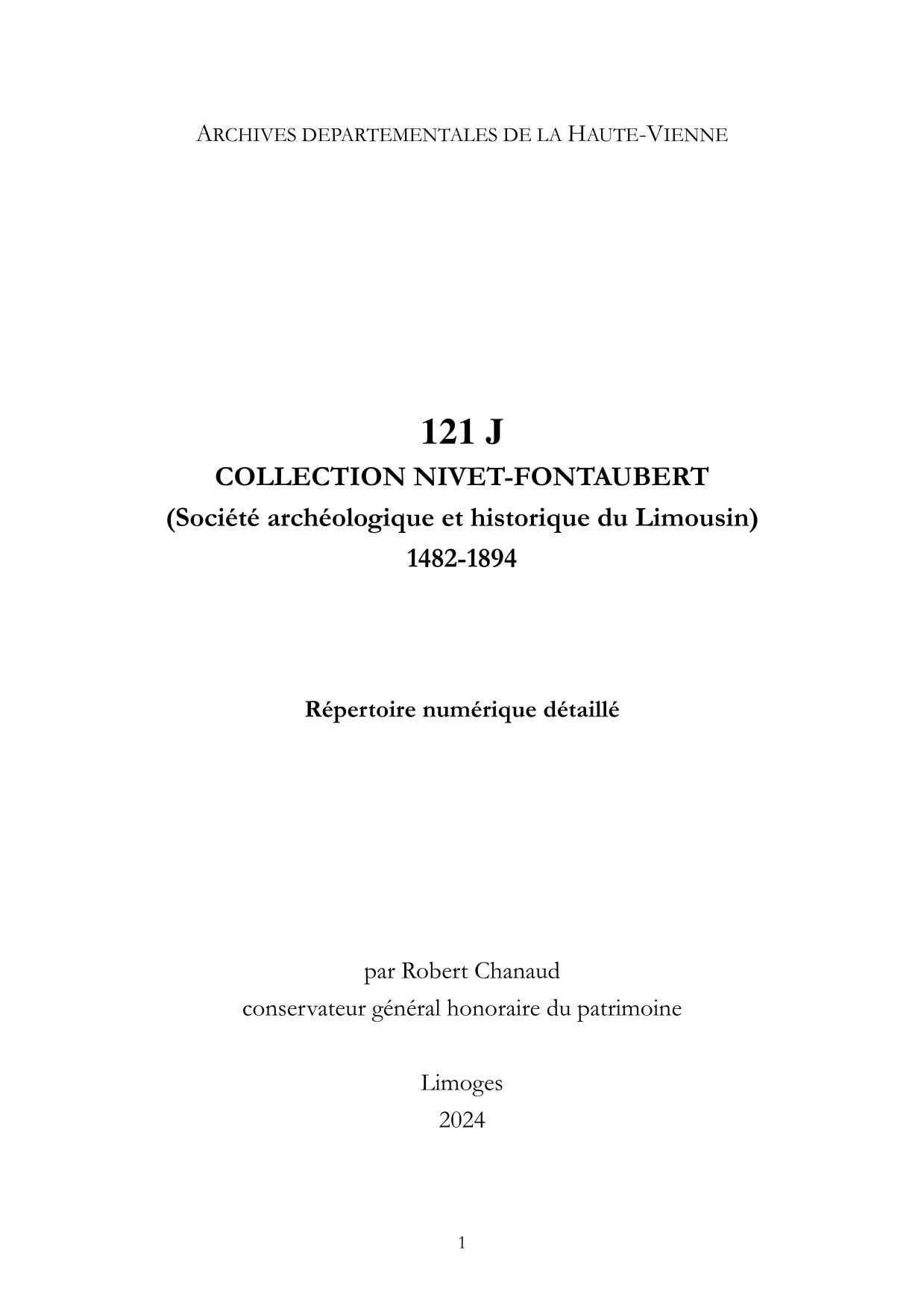 121 J. Répertoire numérique détaillé, par Robert Chanaud, Conservateur général honoraire du patrimoine, 2024, 14 p.
