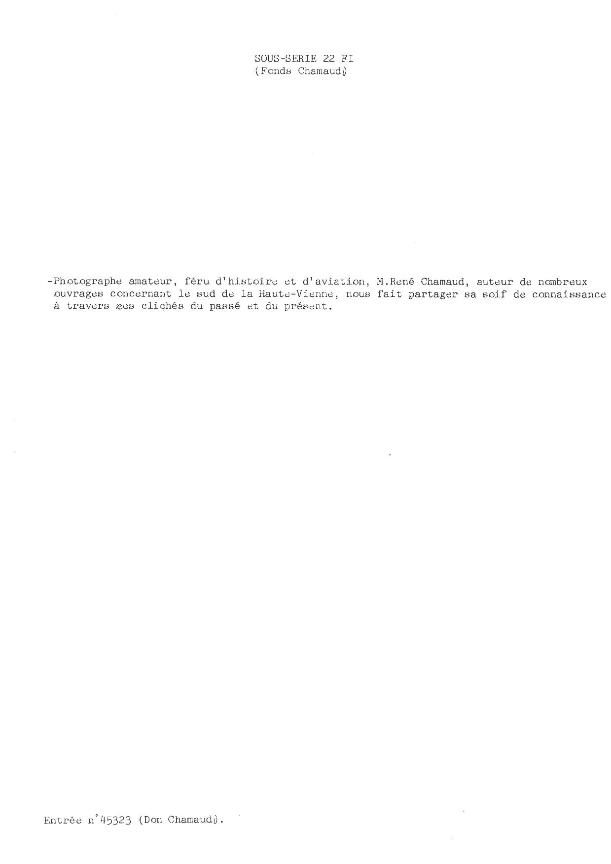 Photographies réalisées par René Chamaud et reproductions de cartes postales rassemblées par lui, relatives surtout à Limoges et au sud du département de la Haute-Vienne. Don de M. Chamaud, 1993.