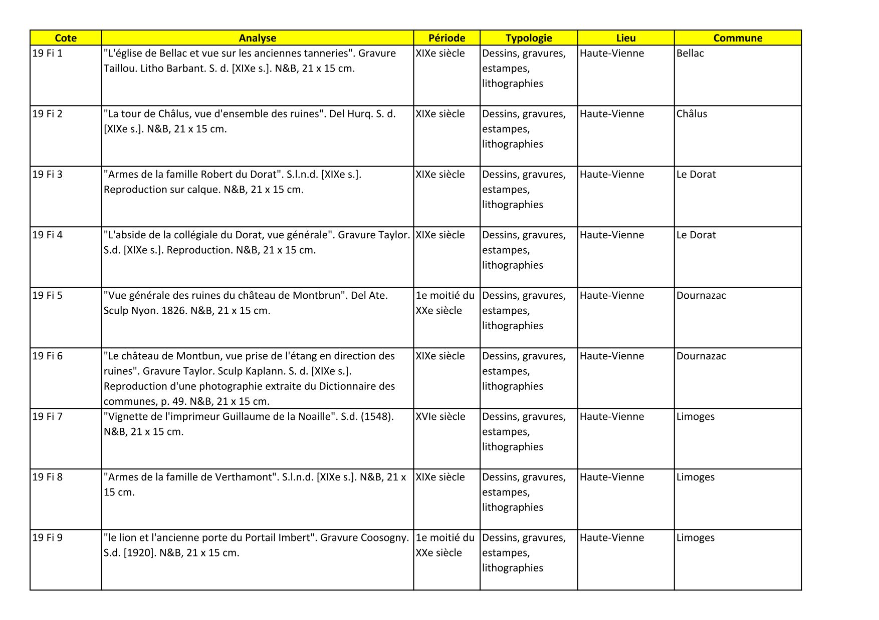 Il s'agit essentiellement de gravures et de lithographies intéressant des localités de la Haute-Vienne. Don, 1969.