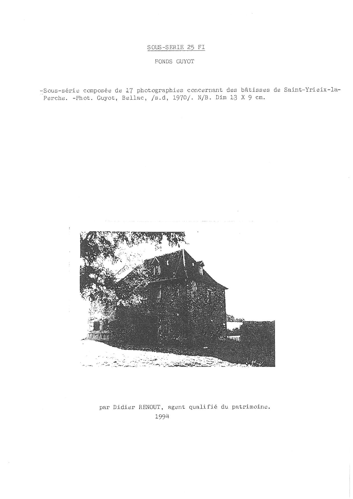 Photographies de bâtiments de Saint-Yrieix-la-Perche réalisées par M. Guyot. Don de M. Guyot, vers 1970.