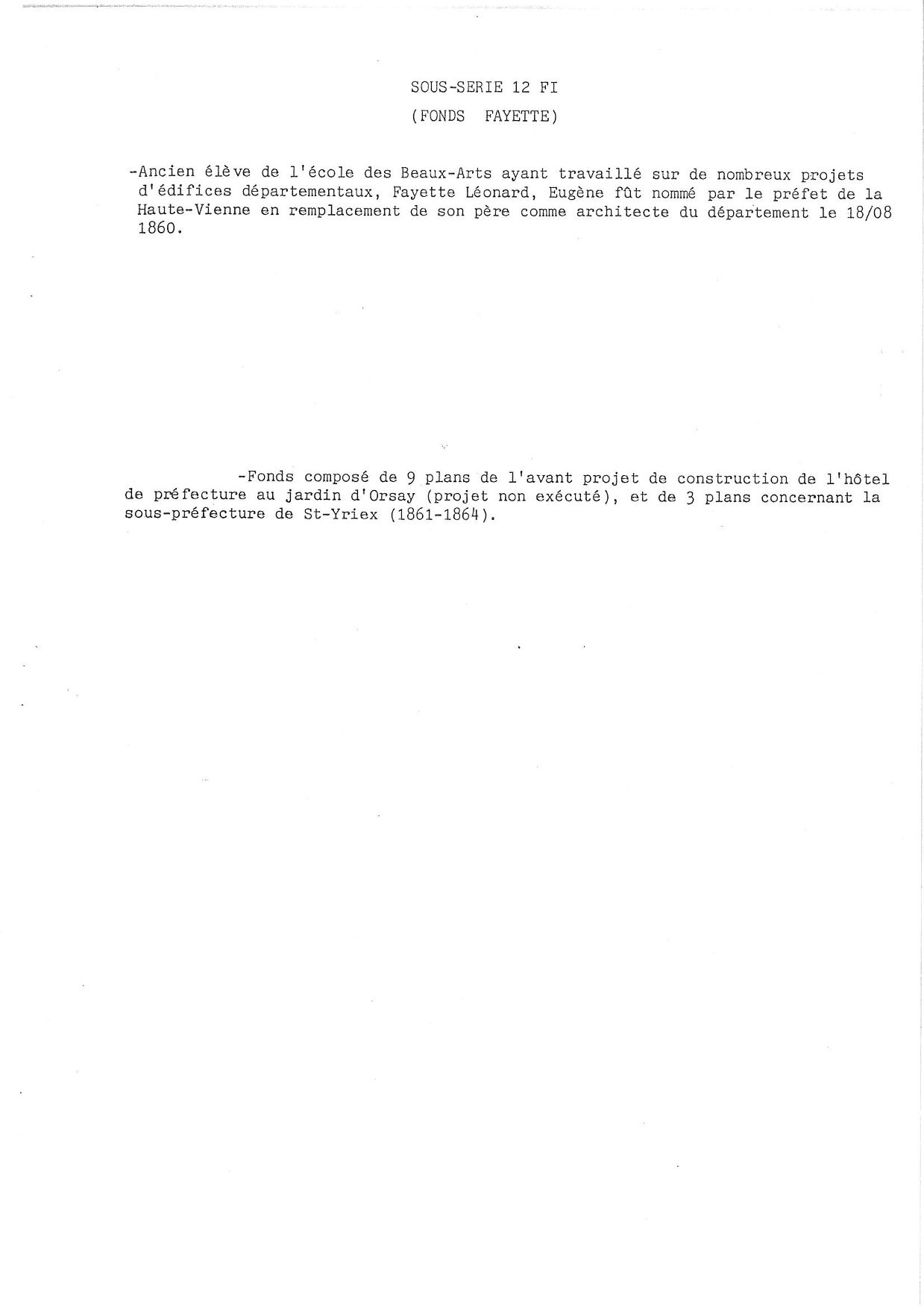 Plans originaux dessinés par L. Fayette, architecte du département, pour la préfecture (projet non réalisé) et la sous-préfecture de Saint-Yrieix.