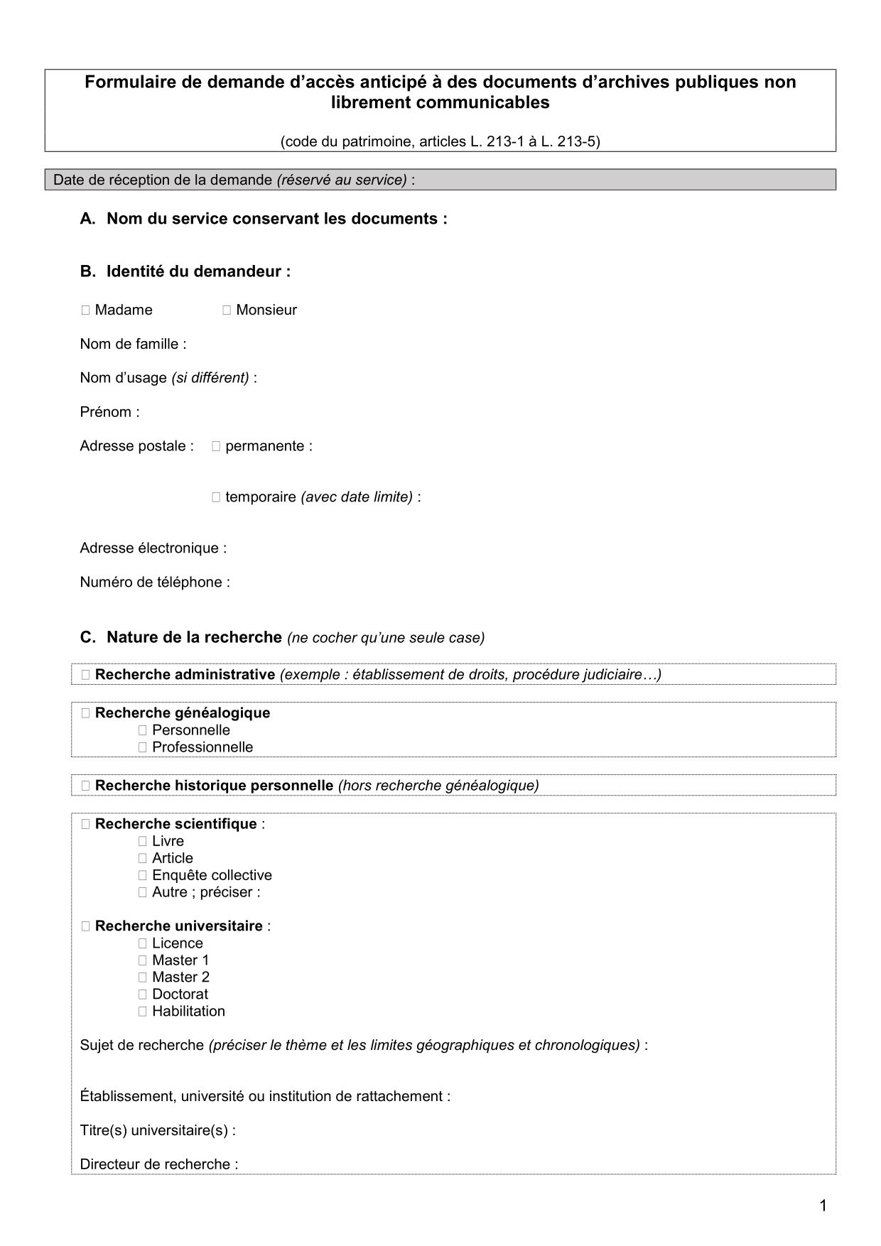 Pour obtenir une dérogation, le demandeur doit remplir un formulaire de demande dérogation (à télécharger sur l'encart à droite de l'écran) et l’adresser aux Archives départementales, chargées d’instruire la demande.