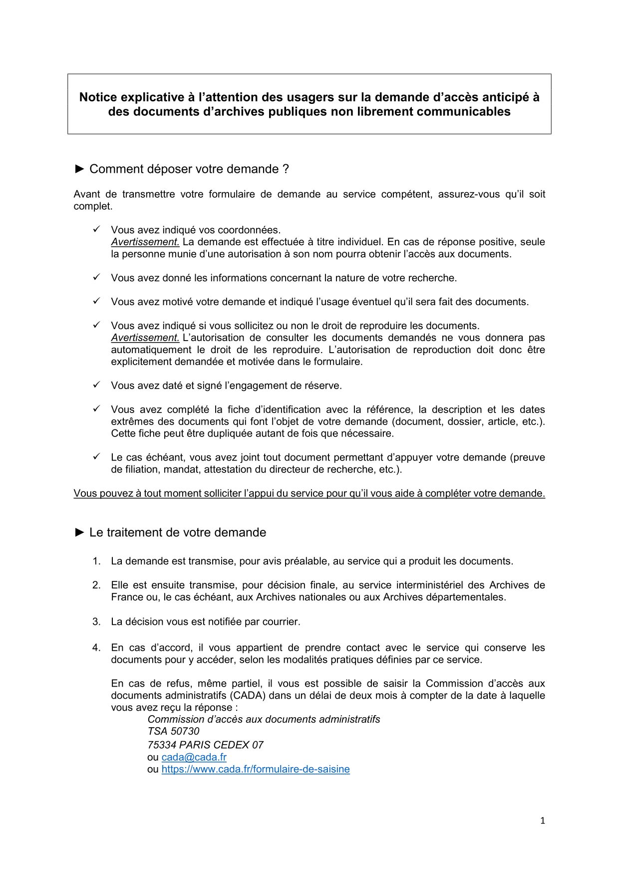Le texte de référence encadrant un accès anticipé aux documents d'archives est consultable sur le site du Service Interministériel des Archives de France (SIAF).