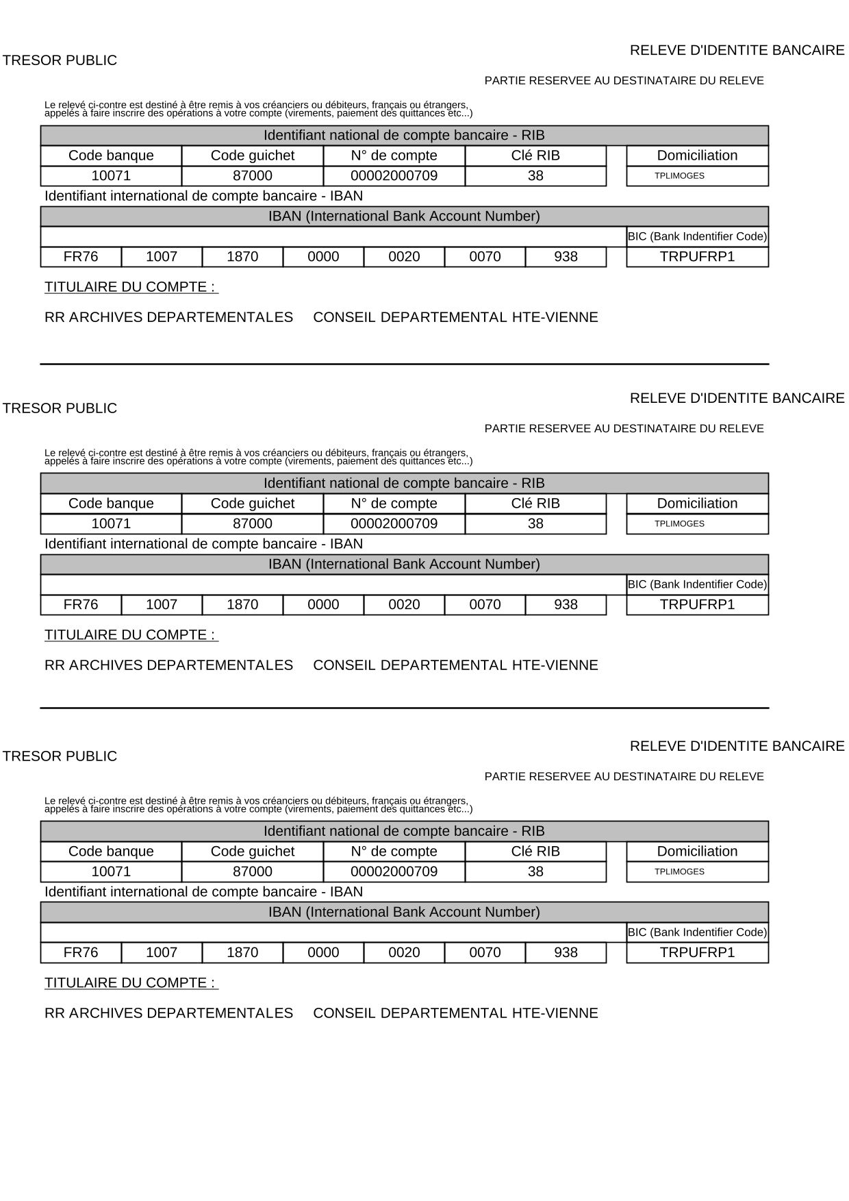 - de préférence par virement bancaire sur le compte de la Régie de recettes des Archives départementales (RIB téléchargeable ci-dessous).