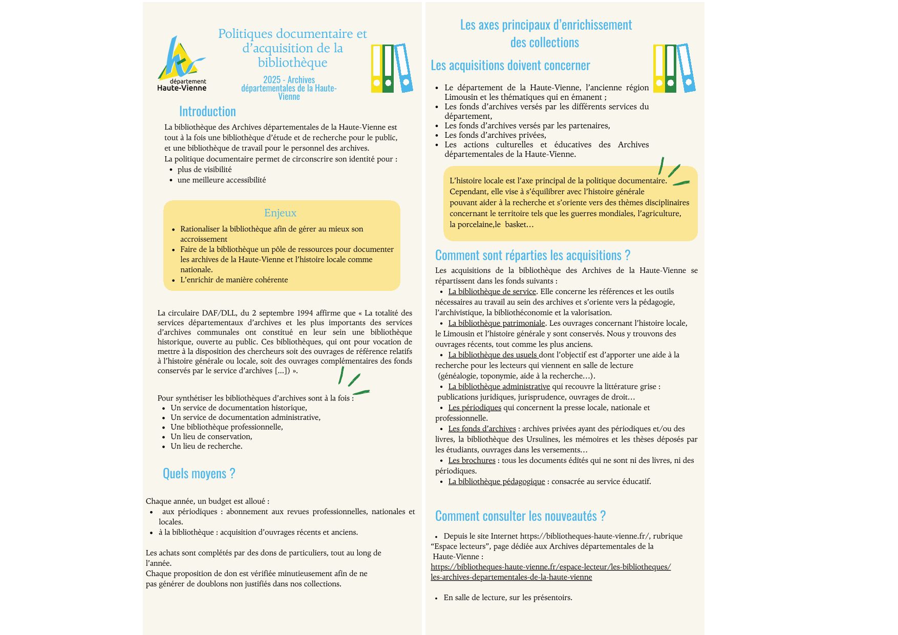 Depuis 2021, les Archives départementales de la Haute-Vienne ont entamé une vaste politique d’informatisation et de rationalisation de sa bibliothèque. Pour ce faire, elle a pu s’équiper d’un système intégré de gestion de bibliothèque (SIGB) mais elle s’est également dotée d’une politique documentaire et d’acquisition afin de lui donner une véritable identité.