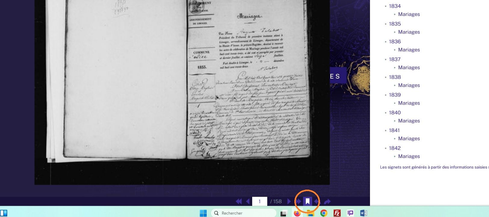 Les opérations de mise en ligne des compléments et corrections (voire nouvelle numérisation) des registres paroissiaux se poursuit. Un travail minutieux de pose de signets est également en cours pour bon nombre de registres. Ces signets vous permettent de naviguer plus vite entre les années et ou les types d’acte au sein d’un registre. Ils sont cliquables via le symbole entouré en orange sur la capture d’écran ci-après.