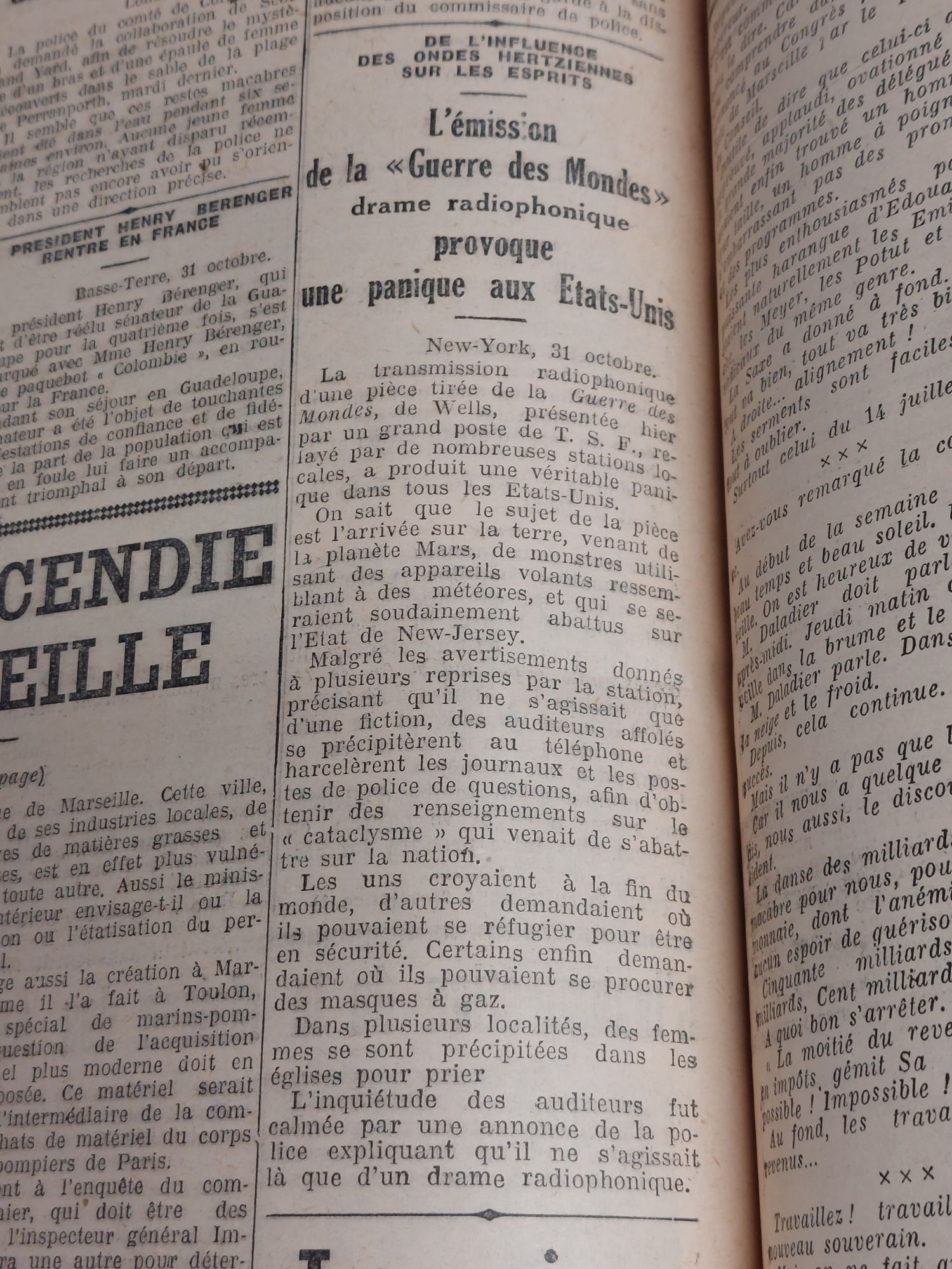 L’émission radiophonique La Guerre des Mondes, pièce tirée par Orson Wells du roman éponyme, a provoqué une panique aux Etats-Unis, de nombreux pensant après ce canular sur les ondes, que les martiens avaient débarqués sur terre. L’émission date du 30 octobre 1938.