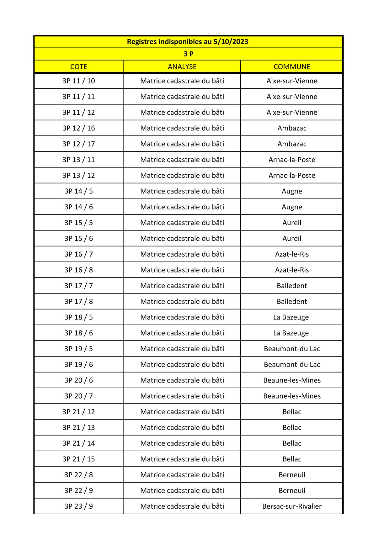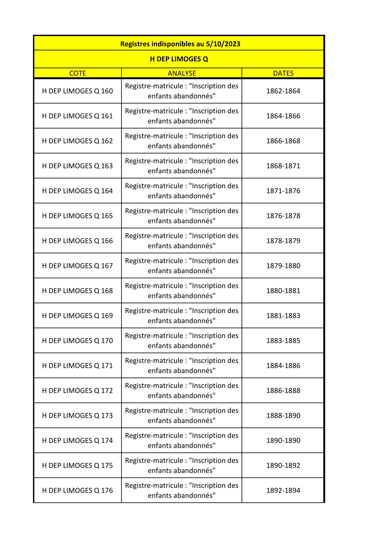 Les matrices cadastrales du bâti (sous-série 3 P) ainsi que les registres matricules des enfants abandonnés (sous-série H DEPOT LIMOGES Q) sont en cours de numérisation en vue d'une mise en ligne.