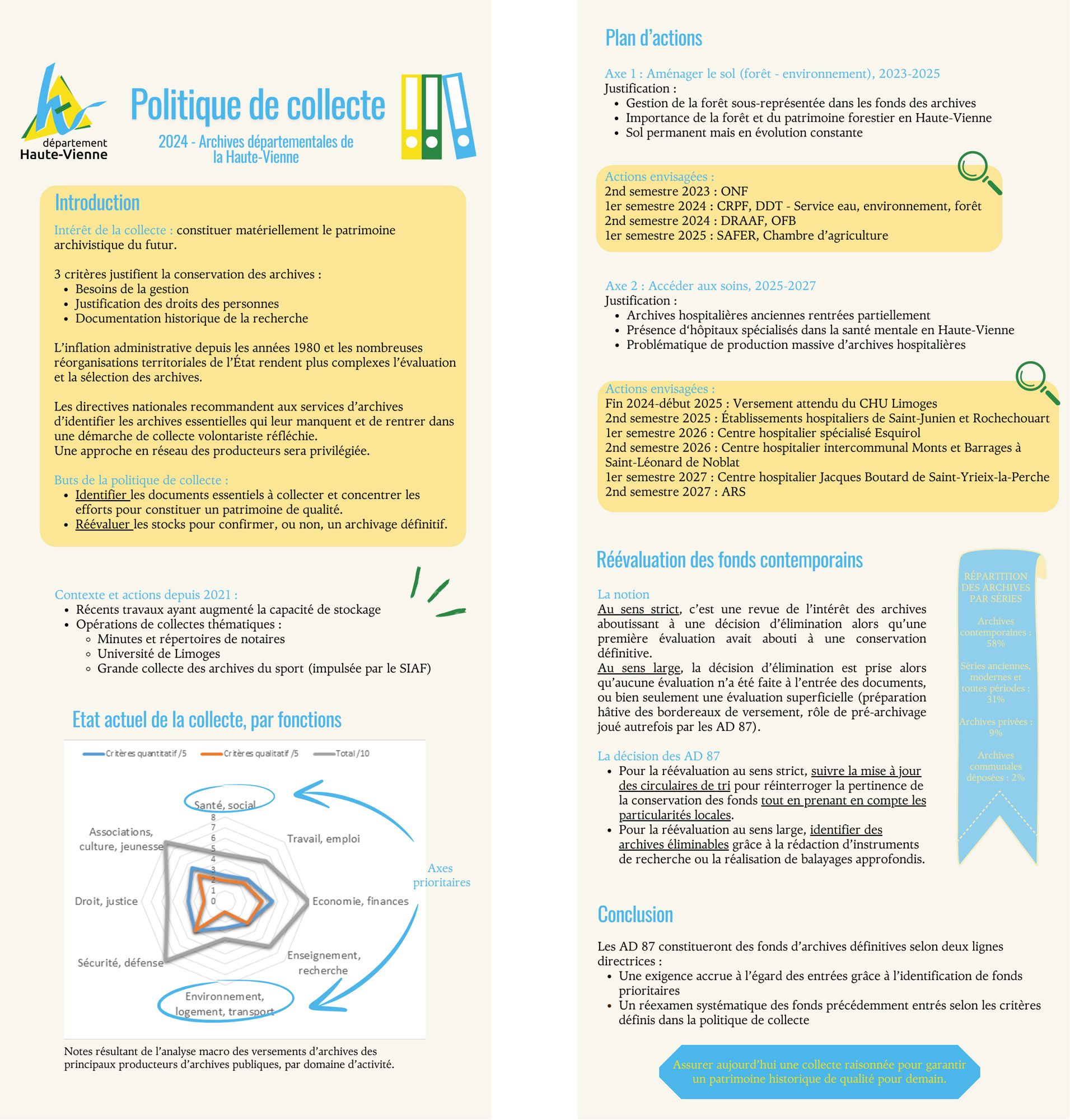 Face aux contraintes qui pèsent davantage de nos jours sur la production documentaire et à l’importance de la sélection des archives contemporaines pour l’accès futur aux archives, les Archives départementales de la Haute-Vienne se sont dotées d’une politique de collecte des fonds d’archives. Ce document s’inscrit dans une politique nationale portée par le Service interministériel des Archives de France (SIAF) et vise à orienter les actions de collecte et les contacts envers les producteurs d’archives dans les années à venir, en fonction d’un bilan de la collecte dressé en 2024.