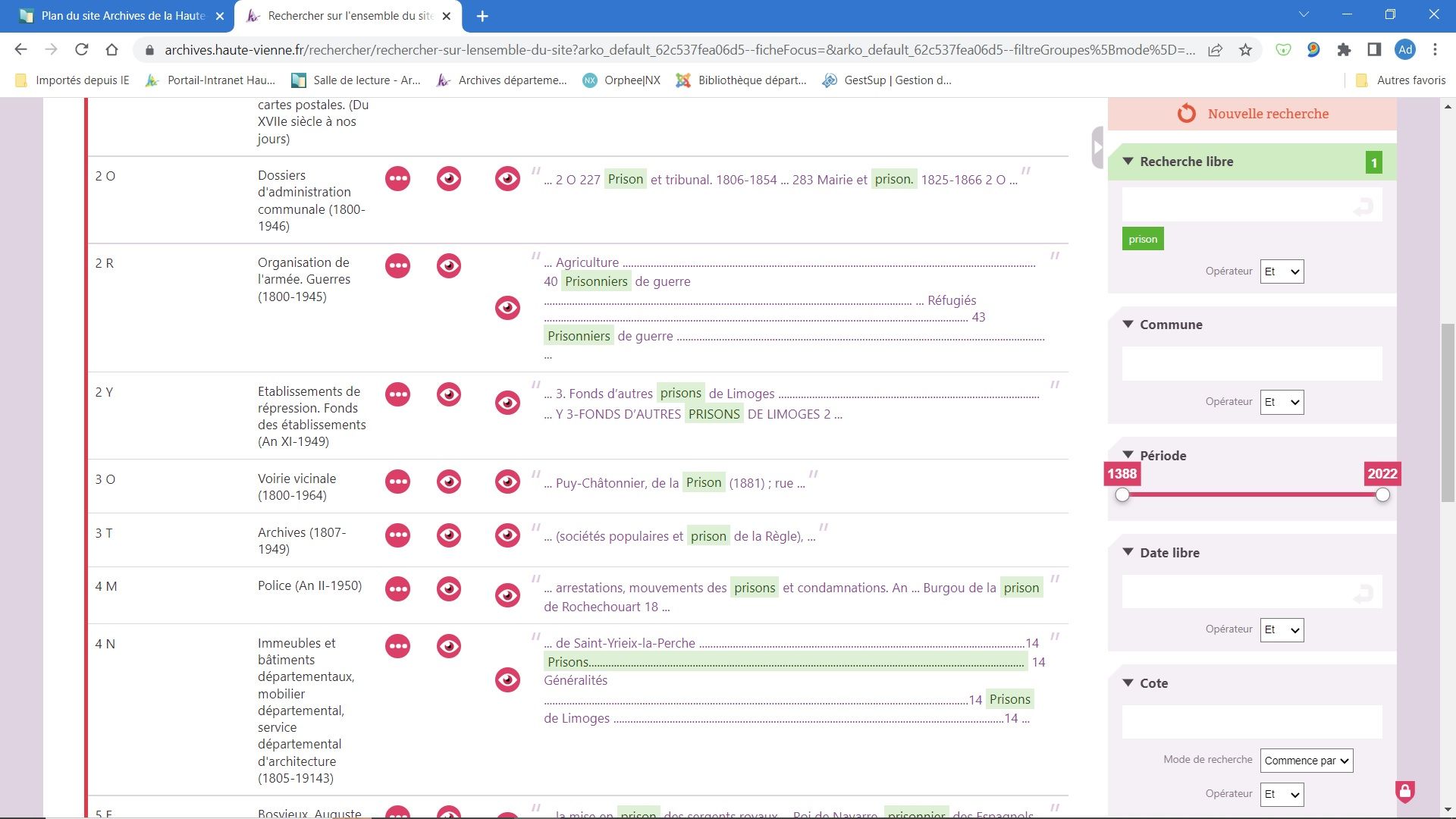 Lorsque vous saisissez un ou plusieurs mots clés et sélectionnez "inventaires", le moteur de recherche va faire le tri dans l'ensemble des données du site et va vous afficher des extraits contenant le mot saisi.