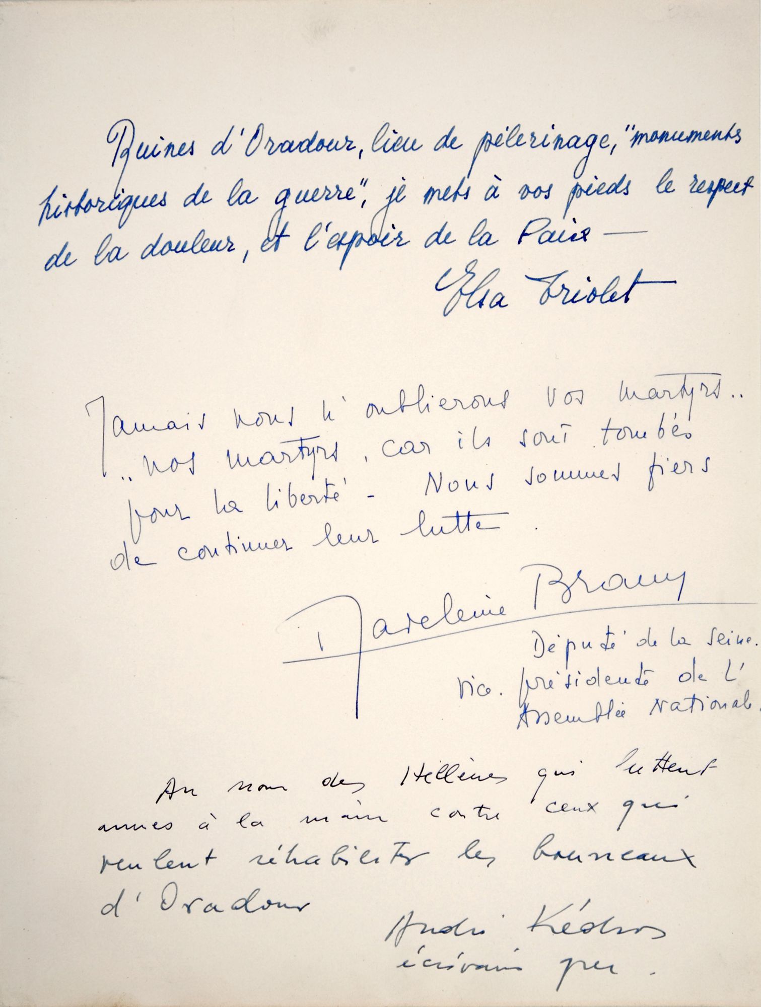 - Une présentation du Livre d’Or par Pascal Plas, de l’Université de Limoges. À cette occasion, le Livre d'Or d'Oradour-sur-Glane, propriété de la Commune et de l'Association Nationale des Familles des Martyrs, sera sorti des réserves des Archives départementales où il est conservé pour être présenté de manière inédite à cette soirée.