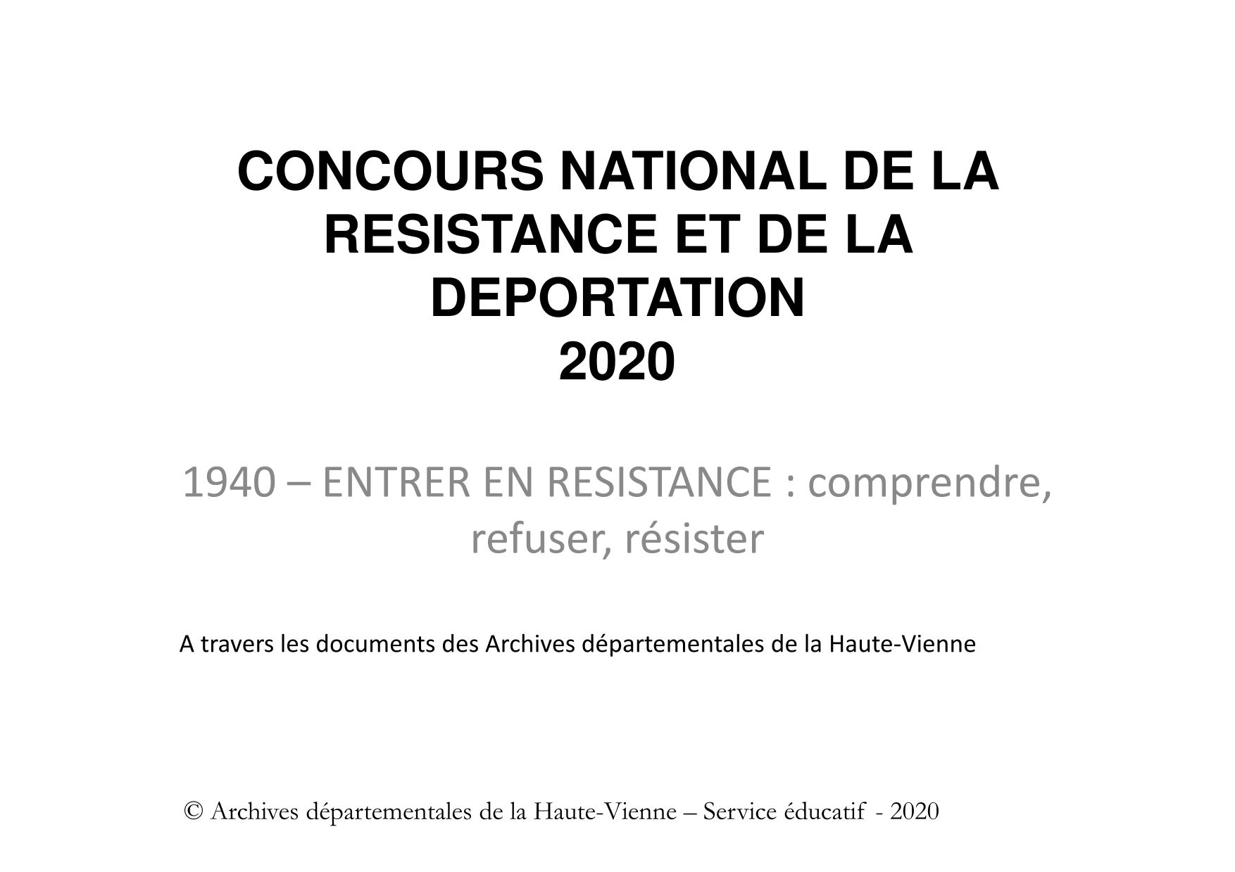 Le thème du concours de la Résistance 2019-2020 est « 1940. Entrer en résistance. Comprendre, refuser, résister ». Le service éducatif vous propose un dossier préparé dans ce cadre, illustré de nombreux documents d'archives.